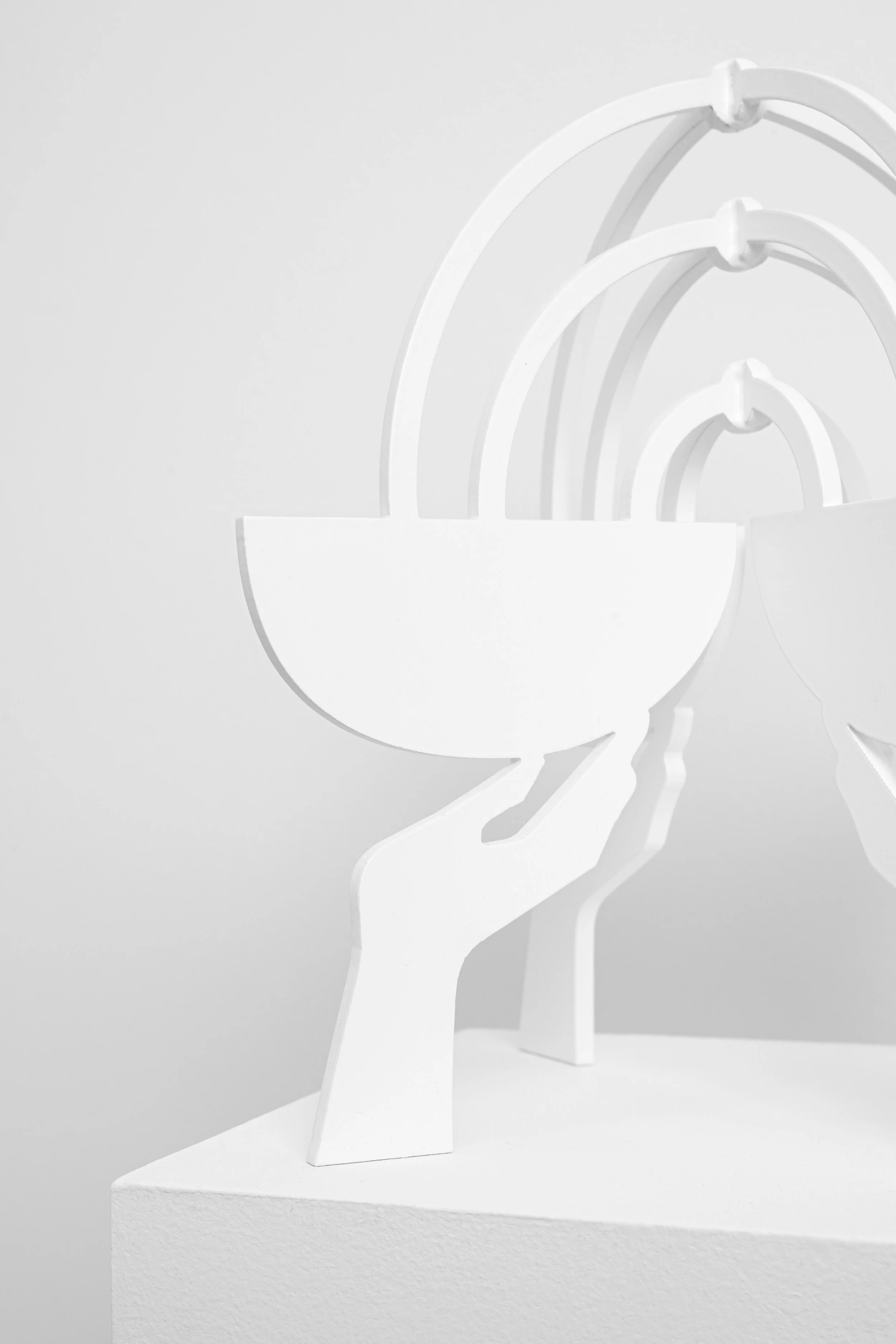 Carolyn Salas’ new intimate sculptures begin at her kitchen table in the midst of everyday life. Before translating her works into flat white steel finished work, Salas first constructs paper models, cutting with scissors and adhering with glue, reshaping and configuring repeatedly. While starting from a place of abstraction and focusing on the simplification of the human form she continues to reference ancient Egyptian carvings, and works by modernist sculptors such as Constantin Brancusi and Naum Gabo. Suggesting a more complicated and contemporary dialogue derived from art-historical cornerstones these new sculptures seem to simultaneously engage conflicting expectations of womanhood and presenting feminine identity as a balancing act: precarious and full of contrasting possibilities. Surrounded by children and family, these works absorb her innermost familial and personal moments and in turn reflect imagery of balance and chaos.